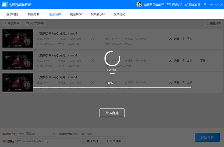 5、最后全部操作完成之后点击开始合并按钮,等待软件分割到100%,那么,所有的视频文件就合并完成了。