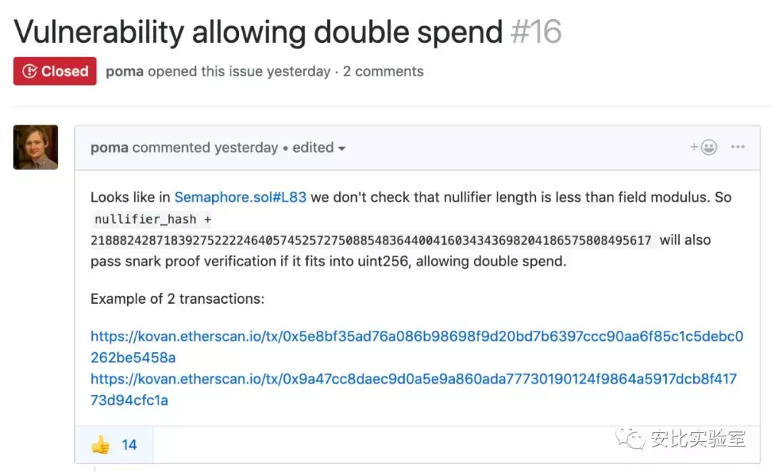 俄罗斯开发者 poma 最先指出该项目可能存在双花漏洞[1]。