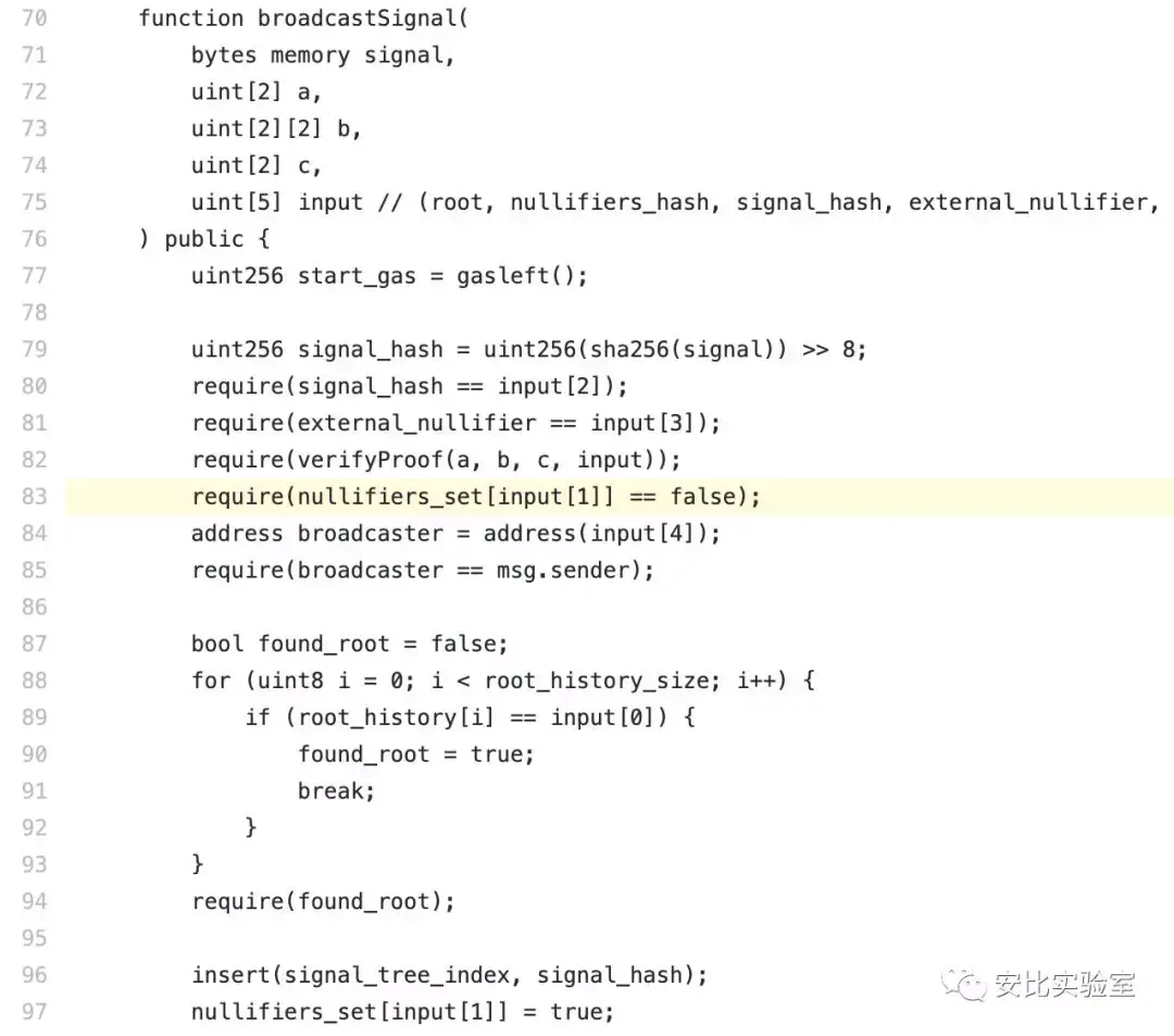 上面代码中的第 82 行 verifyProof(a, b, c, input) 用来证明这笔钱的合法性,input[] 是 public statement,即公共参数。第 83 行通过 require(nullifiers_set[input[1]] == false) 校验这笔钱是否被花过。