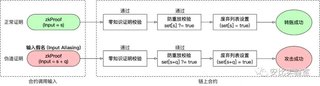 然而事与愿违,这里忽视了一个致命问题。攻击者可根据已成功提交的证明,利用「输入假名」漏洞,对原输入稍加修改便能迅速「伪造证明」,顺利通过合约第 82 行的零知识证明校验,并绕过第 83 行的防双花检查。
