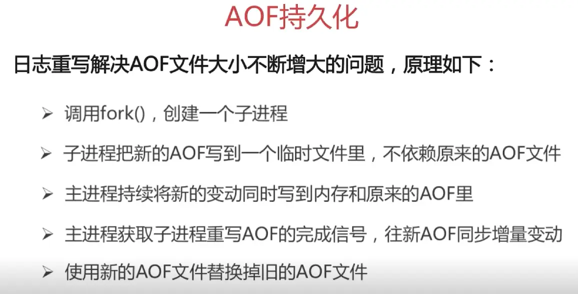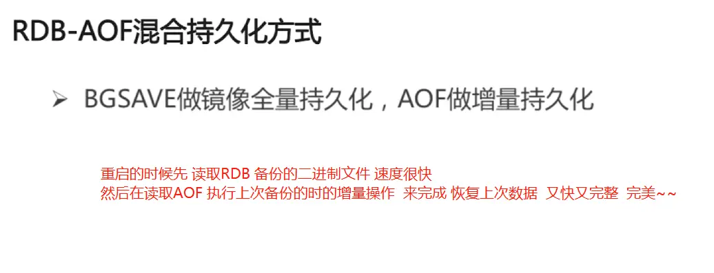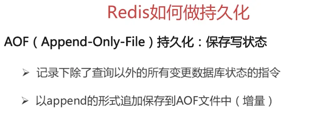 conf 里面的 appendonly no 改为 yes appendfilename "appendonly.aof" // 默认保存的文件的名字 appendfsync everysec // always 每个操作实例化到磁盘 everysec(默认) 没秒同步一次 no 就是不了