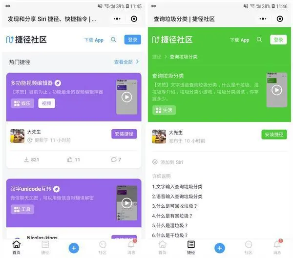 这是一个拥有各种捷径、快捷指令的微信小程序,在里面我们可以看到有很多小伙伴分享上来的Siri捷径、手机快捷指令,都是非常实用的,我们可以在里面找到自己感兴趣的指令并进行使用。