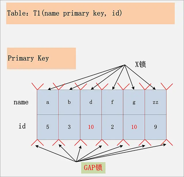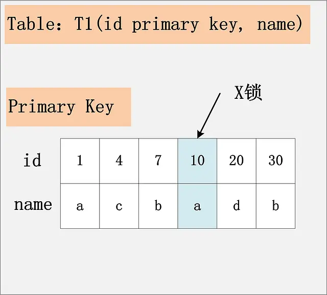 相对于前面三个组合,这是一个比较特殊的情况。id列上没有索引,where id = 10;这个过滤条件,没法通过索引进行过滤,那么只能走全表扫描做过滤。对应于这个组合,SQL会加什么锁?或者是换句话说,全表扫描时,会加什么锁?这个答案也有很多:有人说会在表上加X锁;有人说会将聚簇索引上,选择出来的id = 10;的记录加上X锁。那么实际情况呢?请看下图: