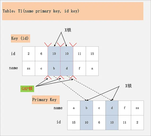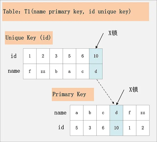 此组合中,id是unique索引,而主键是name列。此时,加锁的情况由于组合一有所不同。由于id是unique索引,因此delete语句会选择走id列的索引进行where条件的过滤,在找到id=10的记录后,首先会将unique索引上的id=10索引记录加上X锁,同时,会根据读取到的name列,回主键索引(聚簇索引),然后将聚簇索引上的name = ‘d’ 对应的主键索引项加X锁。为什么聚簇索引上的记录也要加锁?试想一下,如果并发的一个SQL,是通过主键索引来更新:update t1 set id = 100 where name = ‘d’; 此时,如果delete语句没有将主键索引上的记录加锁,那么并发的update就会感知不到delete语句的存在,违背了同一记录上的更新/删除需要串行执行的约束。