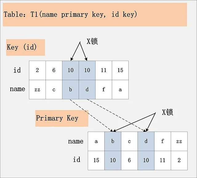由于id列上没有索引,因此只能走聚簇索引,进行全部扫描。从图中可以看到,满足删除条件的记录有两条,但是,聚簇索引上所有的记录,都被加上了X锁。无论记录是否满足条件,全部被加上X锁。既不是加表锁,也不是在满足条件的记录上加行锁。