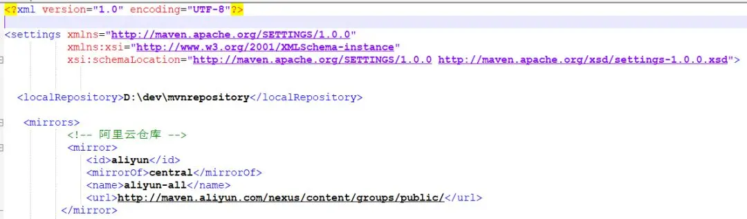 这里提醒一下,Apache Maven 本地仓库的地址是自动生成的,通常在C盘的用户目录里,所以在实际开发中推荐大家指定本地仓库的地址,避免因重装系统或被第三方安全工具清理而丢失数据。Maven的配置很简单,删掉注释后一目了然。(注:Maven不熟悉的,可以在我们Java知音公众号回复"maven视频",获取maven视频教程)如图: