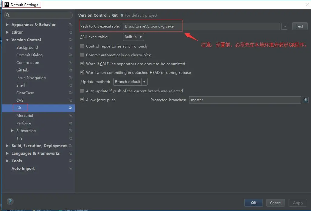 使用说明:IDEA默认集成了对Git/Svn的支持 直接设置执行程序,右边Test提示成功即可。
