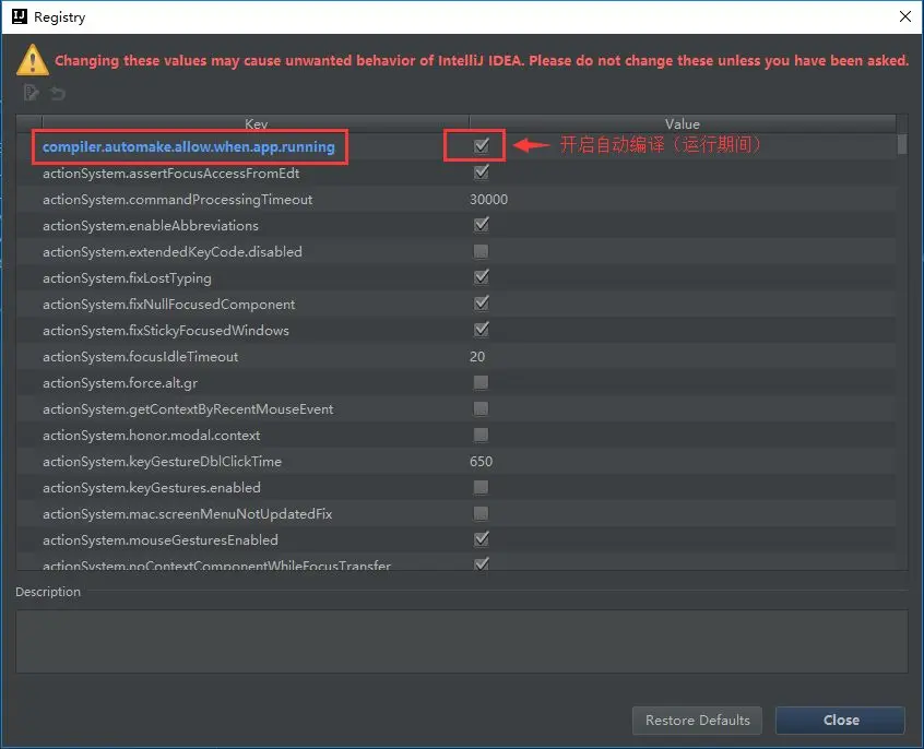 具体步骤:敲击 Ctrl + Shift + Alt + / 然后双击Shift搜索进入Registry ,找到compiler.automake.allow.when.app.running ,然后勾选上。