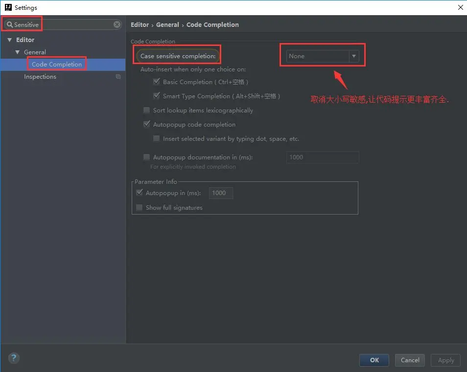 File | Settings | Editor | General | Code Completion Case | Sensitive Completion = None。