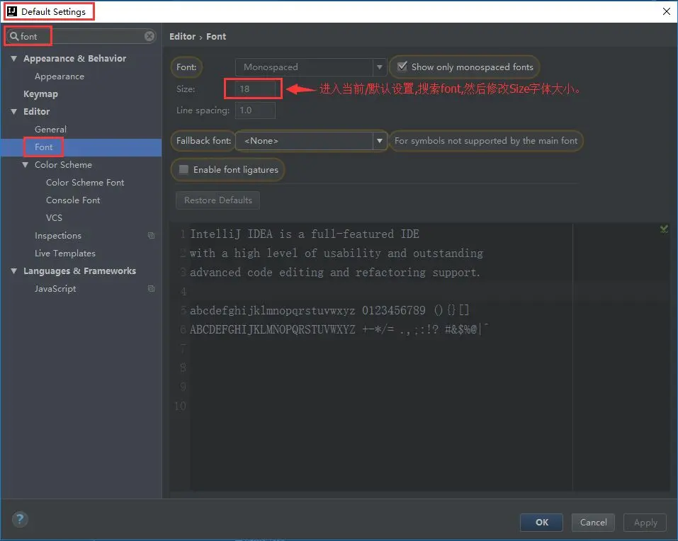 默认的白色背景和细小的字体会影响大家的编码体验,这里特意提供了调整代码窗的快捷配置。打开配置,搜索Font,然后再Font可以调整字体类型,Size可以调整字体大小,如图: