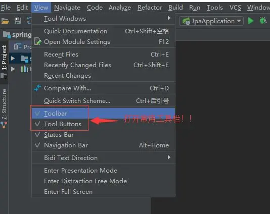 具体步骤:顶部导航栏 - View -> 勾选 Toolbar & Tool Buttons