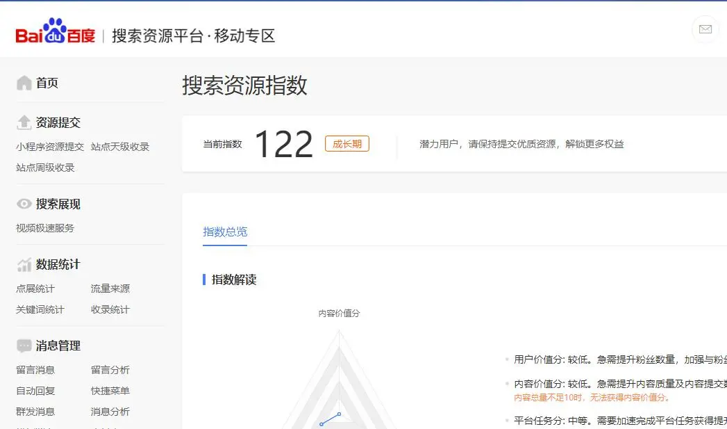 但是还是前赴后继很多人在做百度系的SEO,百度对于移动端政策还是没有变化。你网站做了MIP打开快给你加分展现,你的指数高也给你展现,但是新站由于算法原因,基本做完所有基础题目到122分,就不给加分了,因为新站最少需要一个月以上才给开权利。