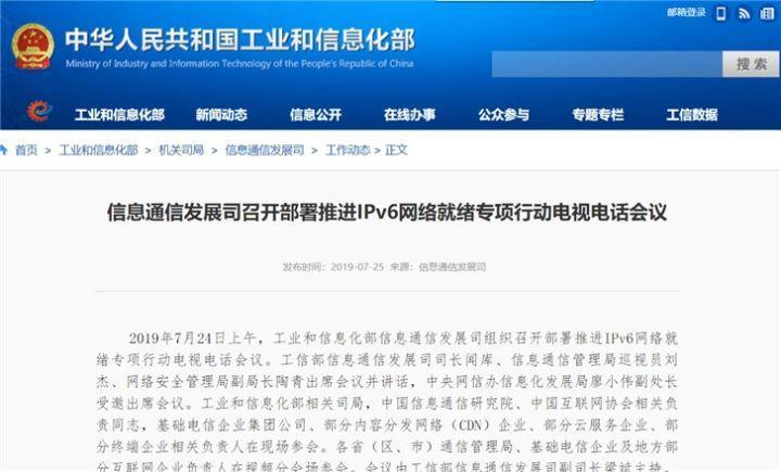 7 月 25 日,工业和信息化部信息通信发展司组织召开部署推进 IPv6 网络就绪专项行动电视电话会议。会议指出,加快推进 IPv6 规模部署,构建高速率、广普及、全覆盖、智能化的下一代互联网,是互联网演进升级的必然趋势。
