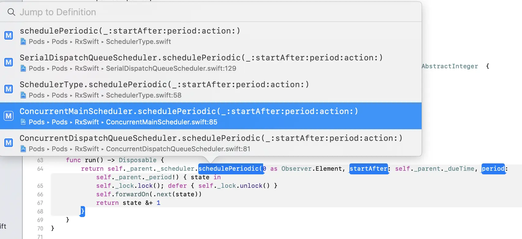 Timer的时候,我们在传参数的时候,对参数scheduler:传入的是MainScheduler.instance,那么我们就跟进去ConcurrentMainScheduler.schedulePeriodic()这个方法;