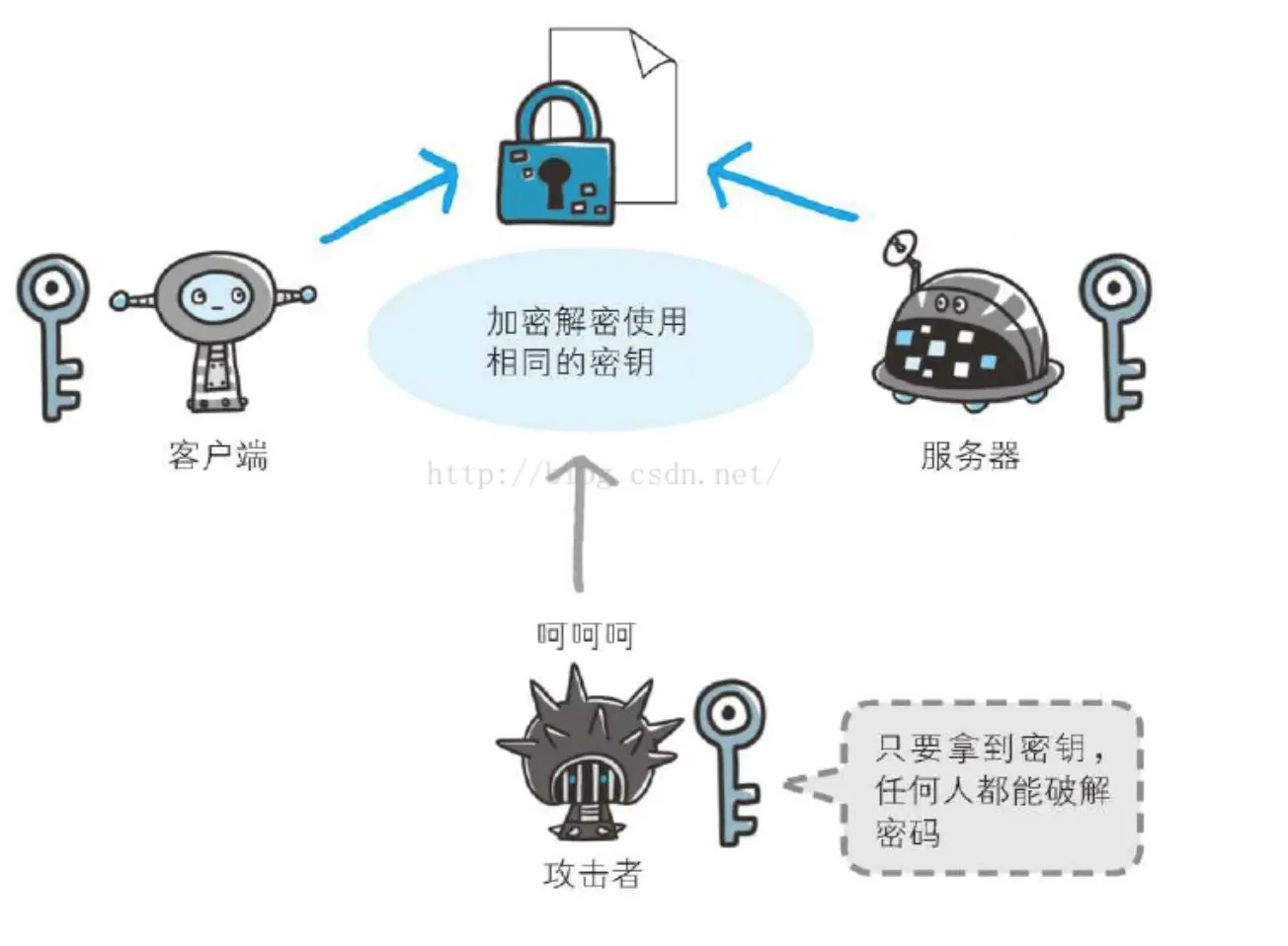 加密和解密都会用到密钥。没有密钥就无法对密码解密,反过来说,任何人只要持有密钥就能解密了。如果密钥被攻击者获得,那加密也就失去了意义。