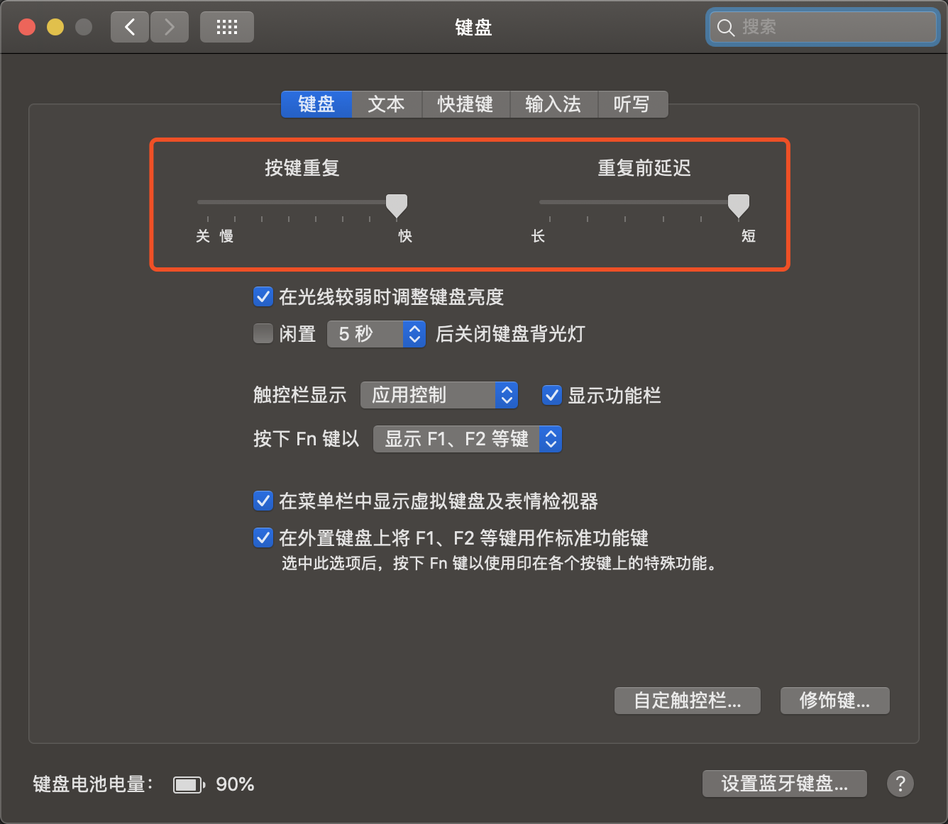 由于高熟练度使用Vim才比较潇洒,在成为一个成熟的Vimer之前,我建议把我们的“按键重复”及“重复前延迟”两个选项开至最骚,以应对光标移动需求。