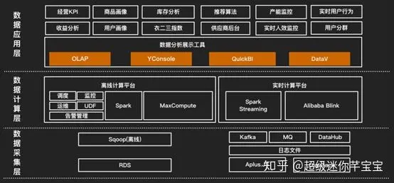 衣二三数据体系架构如图所示,最底层是数据源,包括RDS生产数据库和日志服务等,通过日志服务、DataHub等投递到数据计算层;数据计算层以MaxCompute为核心,同时配合我们自己做的脚本和UDF进行数据存储和计算,生成的结果反馈到前端数据应用层;数据应用层是数据分析展示工具,包括YConsole、QuickBI以及DataV等,我们使用DataV做展示业务全局的看板,让我们快速了解全国各地谁在下单、仓储中心的储备情况等。