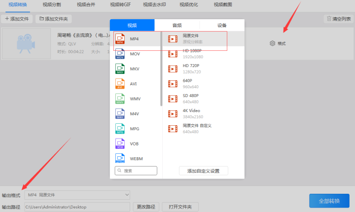2、点击“格式”/“输出格式”按钮设置好需要转换的格式。输出格式又分为输出的视频格式和输出的视频分辨率。由于我们要把qlv格式转换成mp4格式,所以把输出的视频格式调整为‘mp4’格式,而视频格式可以调整为和原视频相同分辨率的‘同原文件’格式。