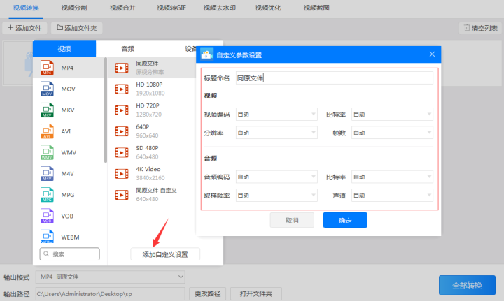 3、如果所选的“mp4同原文件”格式或软件预设的参数满足不了使用需求时可以点击“添加自定义设置”按钮针对视频(视频编码、比特率、分辨率、帧数)和音频(音频编码、比特率、取样频率、声道)的参数进行调整。