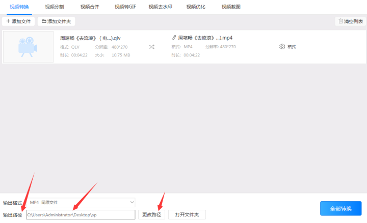 5、在以上设置都调整好后点击“转换”/“全部转换”按钮把qlv格式转换成mp4格式。在转换时软件会出现一个进度条,在进度条到达100%时就表示软件已经把qlv格式转换成mp4了。最后我们只需要在之前预设好的路径找到转换后的mp4文件就可以了。