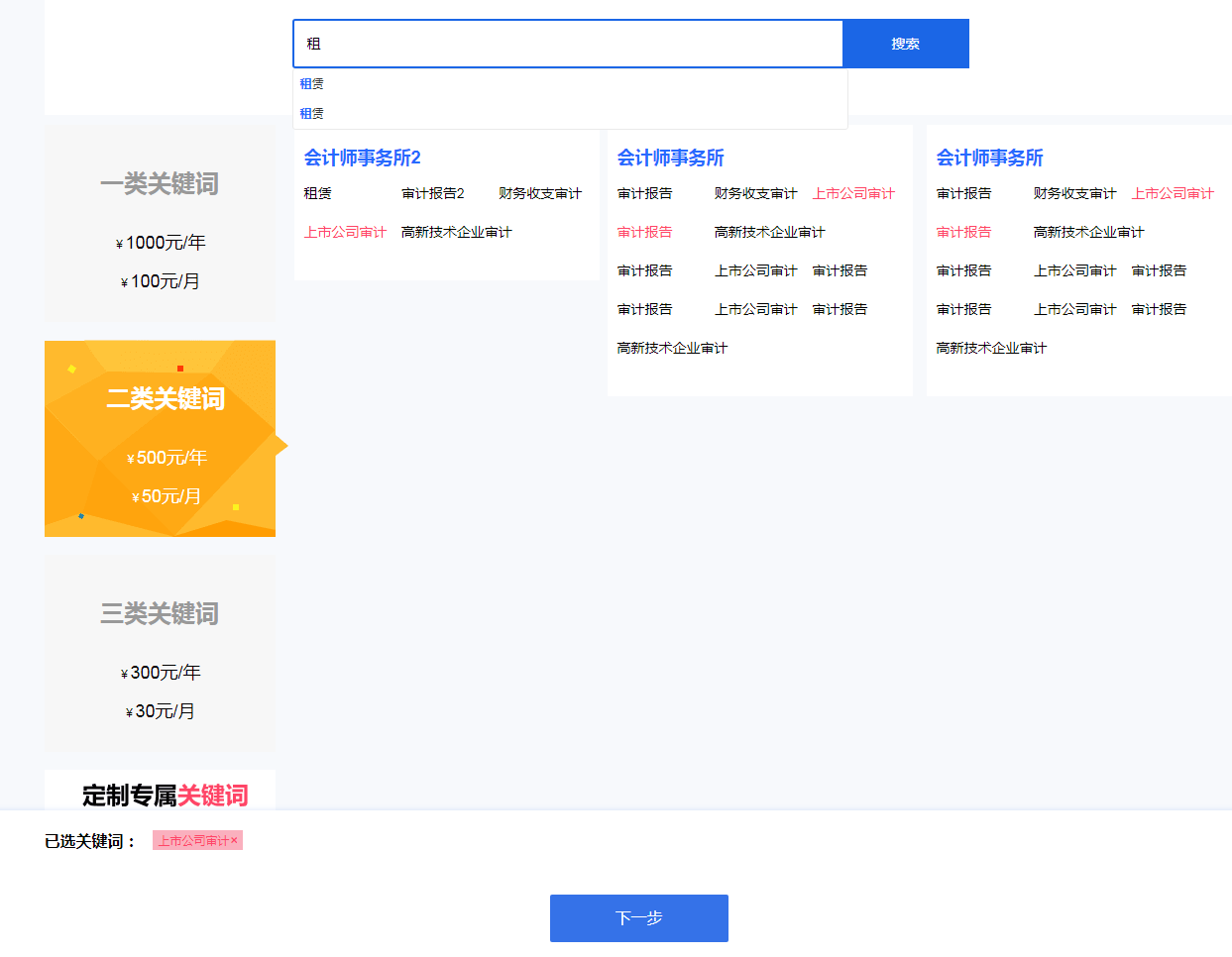 4、点击下一步form标签跳转到购买页面,并将已选关键词id拼接到URL上