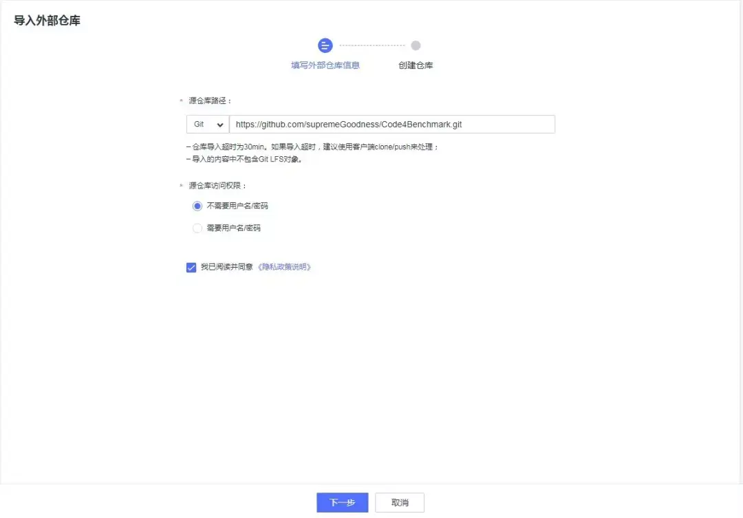 图1 导入外部仓库来新建代码仓库