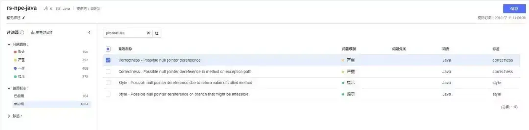 在访问CodeCheckBenchmark项目,并进入“代码”-“代码检查”后,在“规则集”页面“新增规则集”,输入规则集名称rs-npe-java、检查语言等,如图2所示。然后在规则集的配置页面,将“Correctness - Nullcheck of value previously dereferenced”、“Null dereference”、“Correctness - Possible null pointer dereference”等规则从“未启用”规则中选中保存以变为“已启用”规则