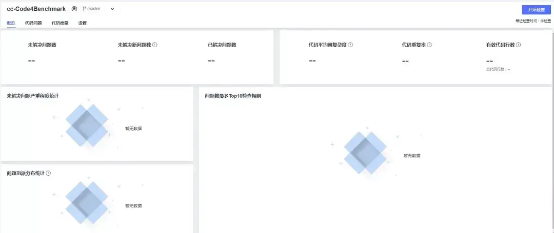 在访问CodeCheckBenchmark项目,并进入“代码”-“代码检查”后,在“任务”页面“新建任务”,选择代码仓库Code4Benchmark、输入任务名称cc-Code4Benchmark等完成任务创建。如图4所示为创建后的任务概览。
