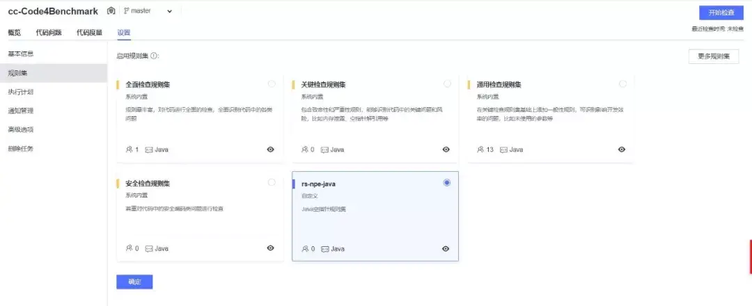 在cc-Code4Benchmark任务中,通过“设置”来配置自定义的规则集rs-npe-java,如图5所示。