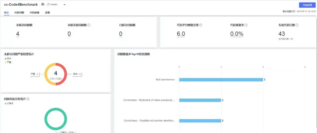 在cc-Code4Benchmark任务中,可以点击“开始检查”。在检查完成后,在“概览”页面查看检查结果,如图6所示。在概览中,我们可以发现检测出4个问题。