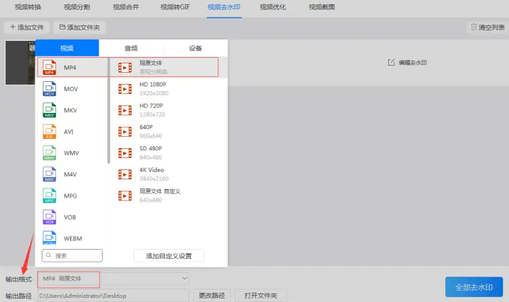 第三步:添加好文件后设置好“输出格式”,输出格式又分为输出的视频格式和输出的视频分辨率。在设置时我们可以将视频格式设置为默认的‘mp4’格式,将视频分辨率设置为默认的‘同原文件’格式。