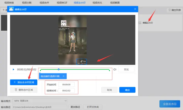 第六步:点击“编辑去水印”针对水印进行设置。在“编辑去水印”的框出现后调整时间区间(开始时间和结束时间)然后点击“添加去水印区域”,此时会出现一个蓝色矩形框,只需将蓝色矩形框覆盖水印即可。