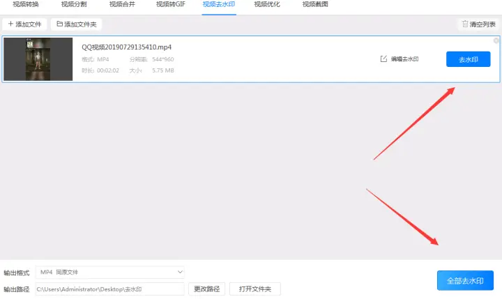 第七步:最后点击“去水印”/“全部去水印”按钮就可以去水印了。在去水印时会出现一个进度条,当进度条到达100%时就表示水印已经去除了。