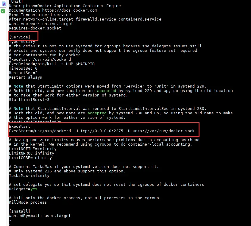 ExecStart=/usr/bin/dockerd -H tcp://0.0.0.0:2375 -H unix://var/run/docker.sock