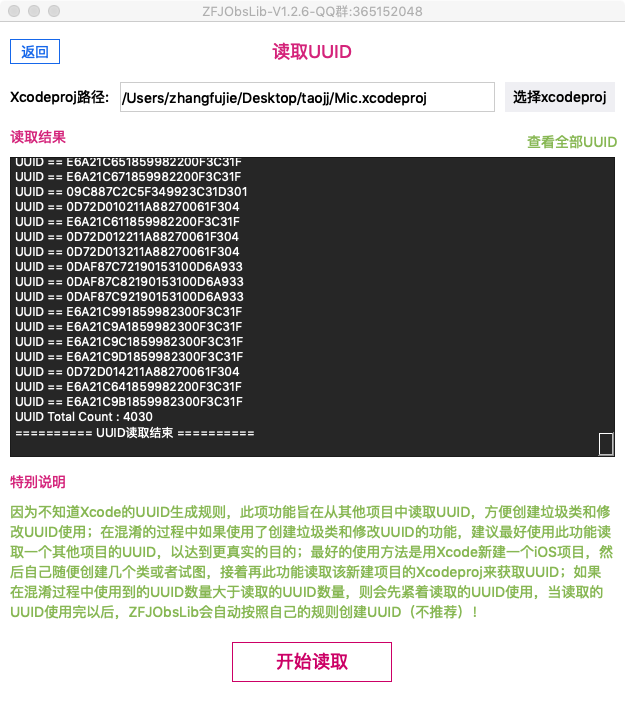 因为不知道Xcode的UUID详细生成规则,此项功能旨在从其他项目中读取UUID,方便创建垃圾类和修改UUID使用;在混淆的过程中如果使用了创建垃圾类和修改UUID的功能,建议最好使用此功能读取一个其他项目的UUID,以达到更真实的目的;最好的使用方法是用Xcode新建一个iOS项目,然后自己随便创建几个类或者试图,接着再此功能读取该新建项目的Xcodeproj来获取UUID;如果在混淆过程中使用到的UUID数量大于读取的UUID数量,则会先紧着读取的UUID使用,当读取的UUID使用完以后,ZFJObsLib会自动按照自己的规则创建UUID(不推荐)!