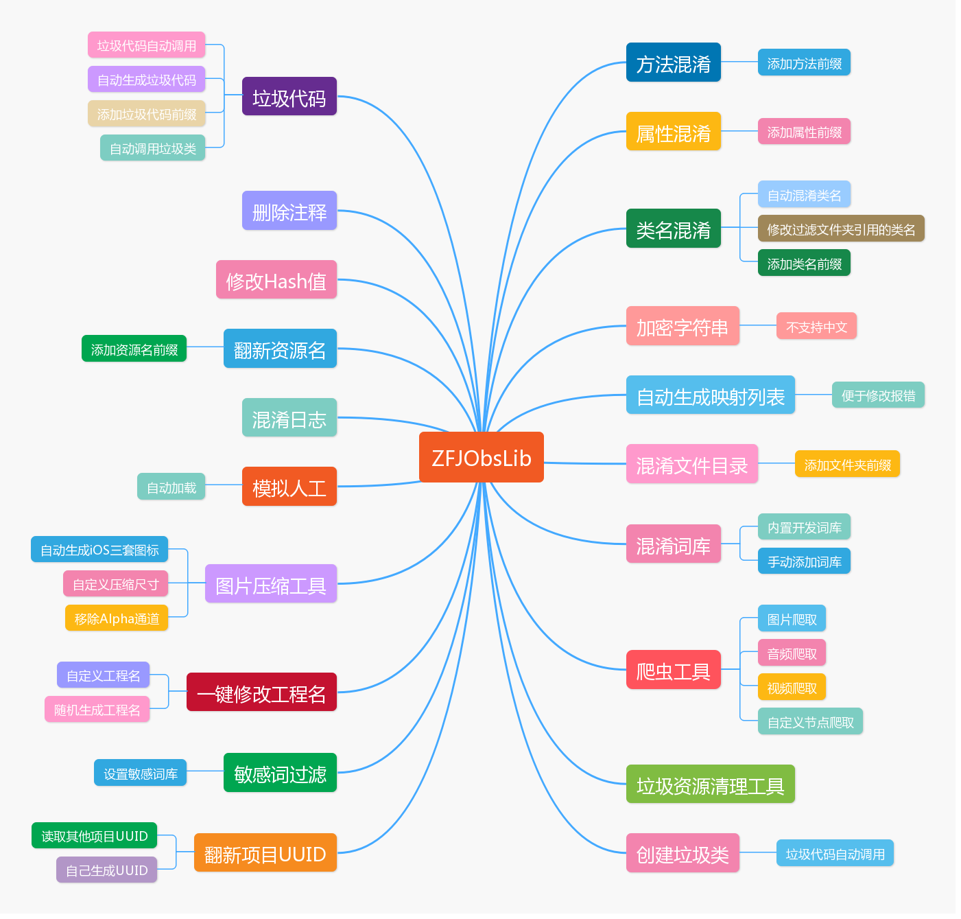 ZFJObsLib主要是通过Python写的混淆工具,具体功能有方法混淆、属性混淆、类名混淆、添加垃圾代码、自动创建垃圾类、删除注释、修改资源文件Hash值、加密字符串、翻新资源名、模拟人工混淆、混淆文件名、混淆文件目录、混淆词库、混淆日志、映射列表、敏感词过滤、图片压缩、爬虫服务、修改项目名、翻新项目UUID,具体的如下: