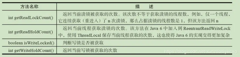 ReadWriteLock仅定义了获取读锁和写锁的两个方法,即readLock()方法和writeLock()方法,而其实现:ReentrantReadWriteLock,除了接口方法之外,还提供了一些便于外界监控其内部工作状态的方法,这些方法以及描述如表所示: