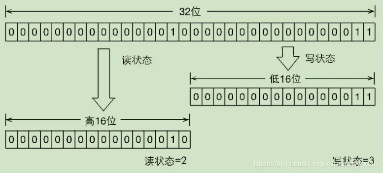 如果在一个整型变量上维护多种状态,就一定需要“按位切割使用”这个变量,读写锁将变量切分成了两个部分,高16位表示读,低16位表示写,划分方式如下图所示: