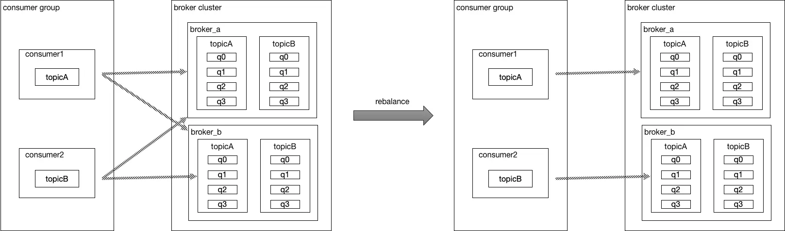 假设有消费组 g1,有消费者 c1 和 c2,c1 订阅了 topicA,c2 订阅了 topicB,集群内有 broker1 和broker2,假设 topicA 有 8 个消息队列,broker_a(q0/q1/q2/q3) 和 broker_b(q0/q1/q2/q3),前面我们知道 findConsumerIdList 方法会获取消费组内所有消费者客户端 ID,topicA 经过平均分配算法进行分配之后的消费情况如下: