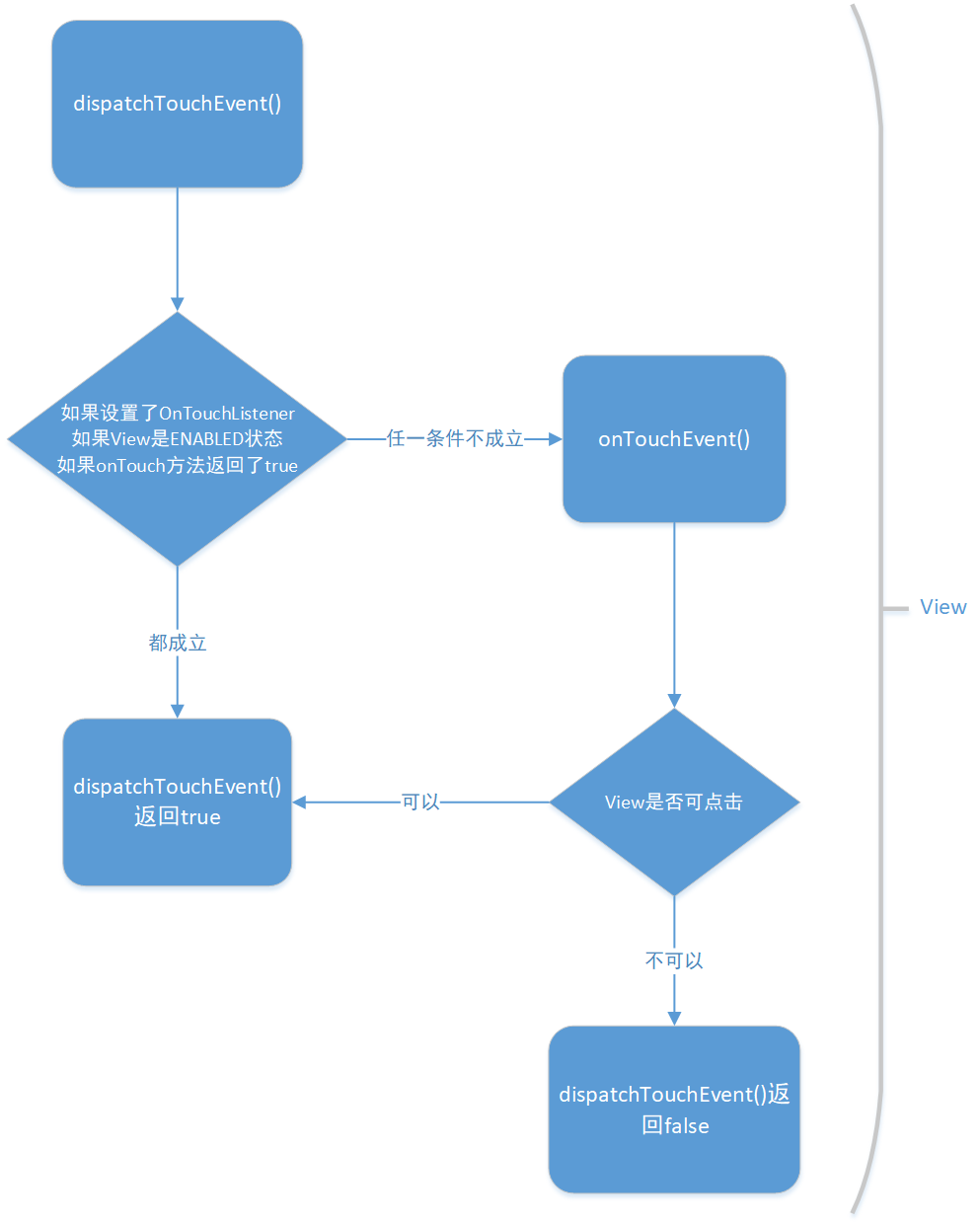 但是如果你没有给你给View设置OnTouchListener或者你给View设置了OnTouchListener,但是onTouch方法返回了false,只要满足这两个条件之一,就会让result保持默认值false,从而满足下面的条件调用View的onTouchEvent()方法。这里得出一个结论:OnTouchListener的onTouch方法的优先级高于onTouchEvent()方法。
