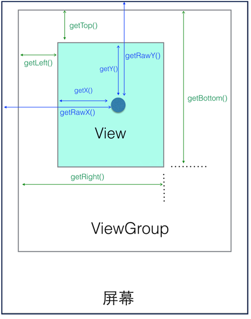 坐标信息也是通过MotionEvent获取,motionEvent.getRawX()、motionEvent.getRawY() 可以获得以屏幕作为参考系的坐标值,motionEvent.getX()、motionEvent.getY() 可以获得以被触摸的 View 作为参考系的坐标值。参考下面的视图坐标:
