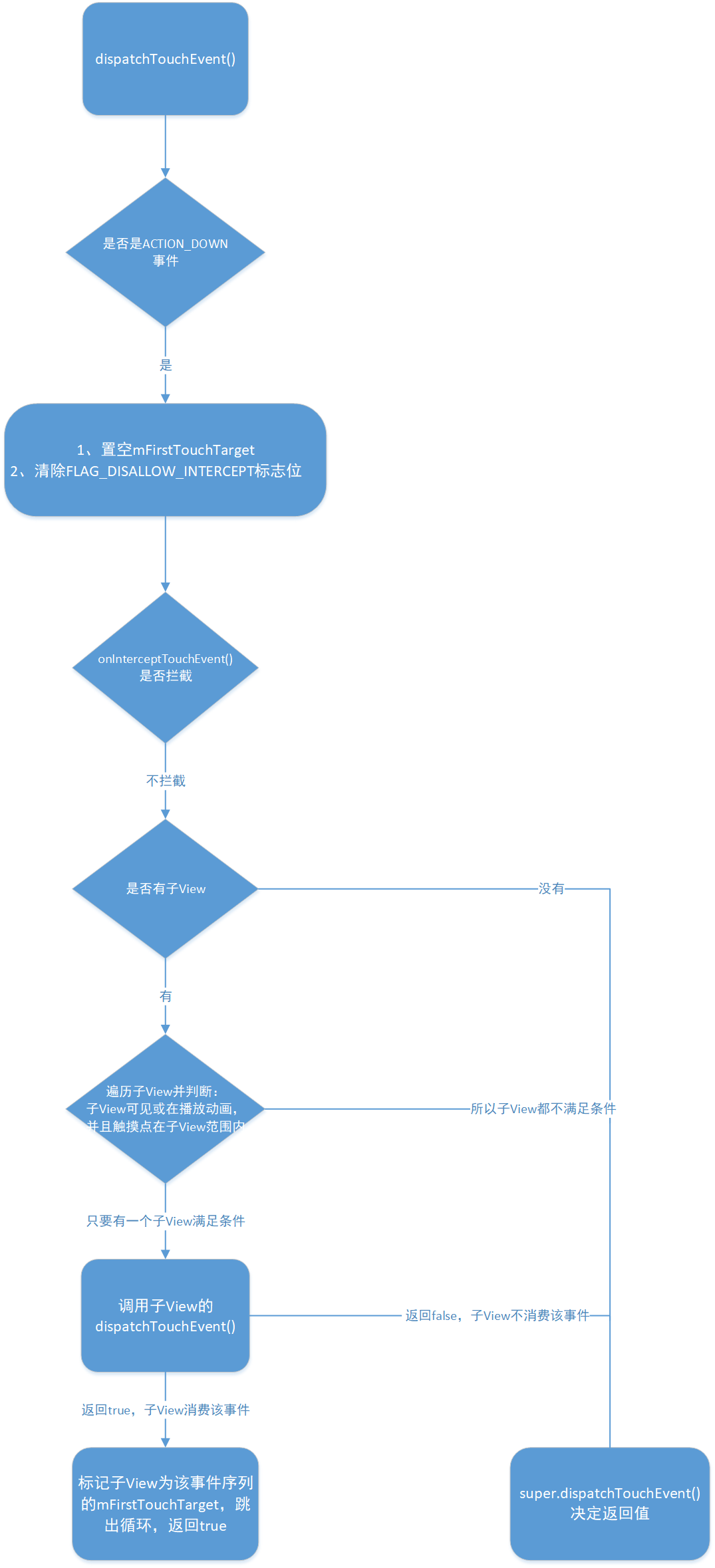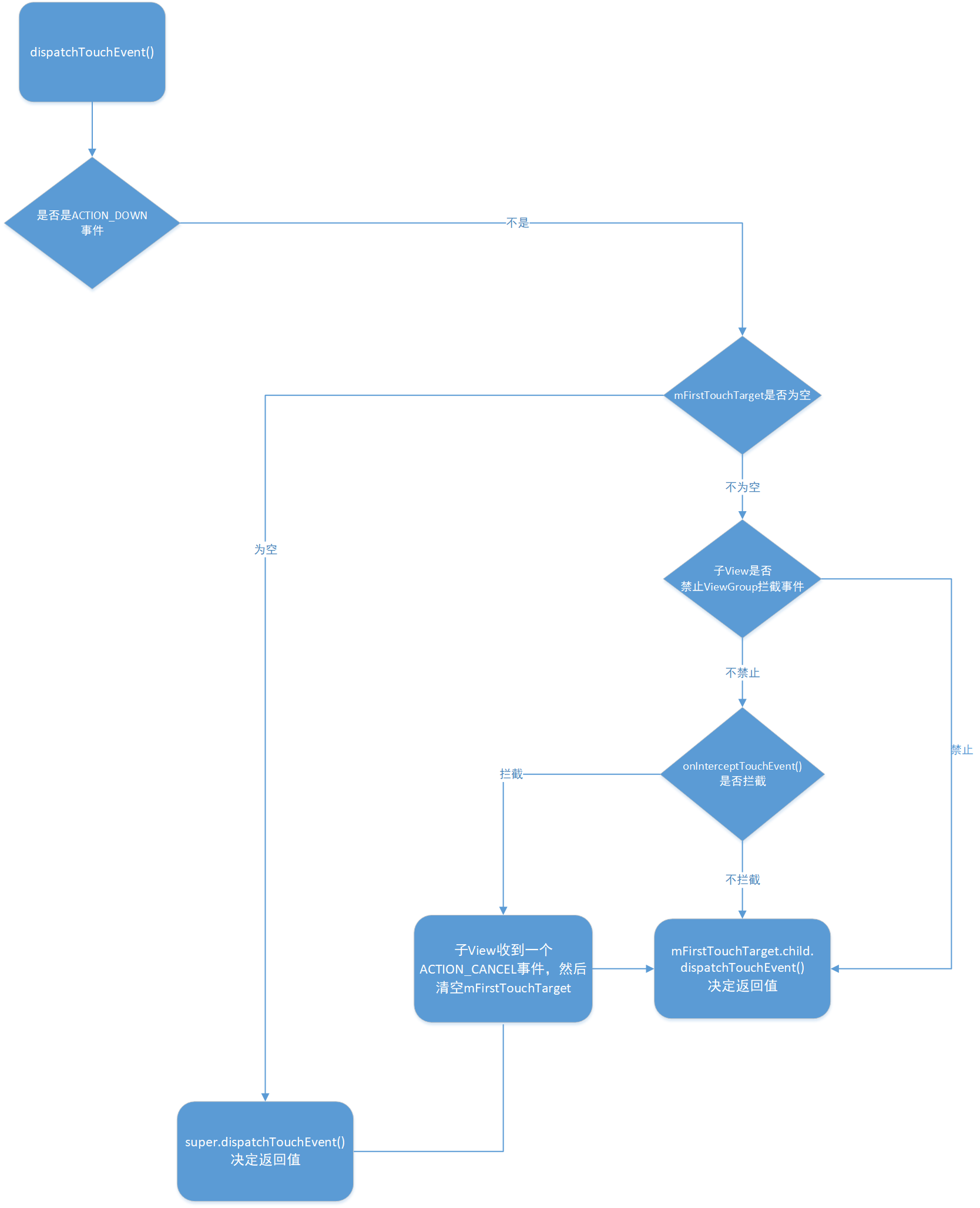 为什么是除了ACTION_DOWN以外的其他事件?因为ACTION_DOWN事件是事件序列的开始,ACTION_DOWN事件会先经过ViewGroup的onInterceptTouchEvent()方法,从ACTION_DOWN事件的处理流程 - intercepted = true我们知道,如果ViewGroup一开始在onInterceptTouchEvent()的ACTION_DOWN返回true,它就不会进入dispatchTouchEvent()方法的注释3的if语句,这样在DOWN事件下就无法找到mFirstTouchTarget,这样当同一个事件序列的其他事件到来时,mFirstTouchTarget == null,这样ViewGroup只能把事件交给自己处理,无法传递给子View,也就无法调用子View的dispatchTouchEvent()方法,这样子View在dispatchTouchEvent()方法中调用getParent.requestDisallowInterceptTouchEvent(true)就没有意义了。