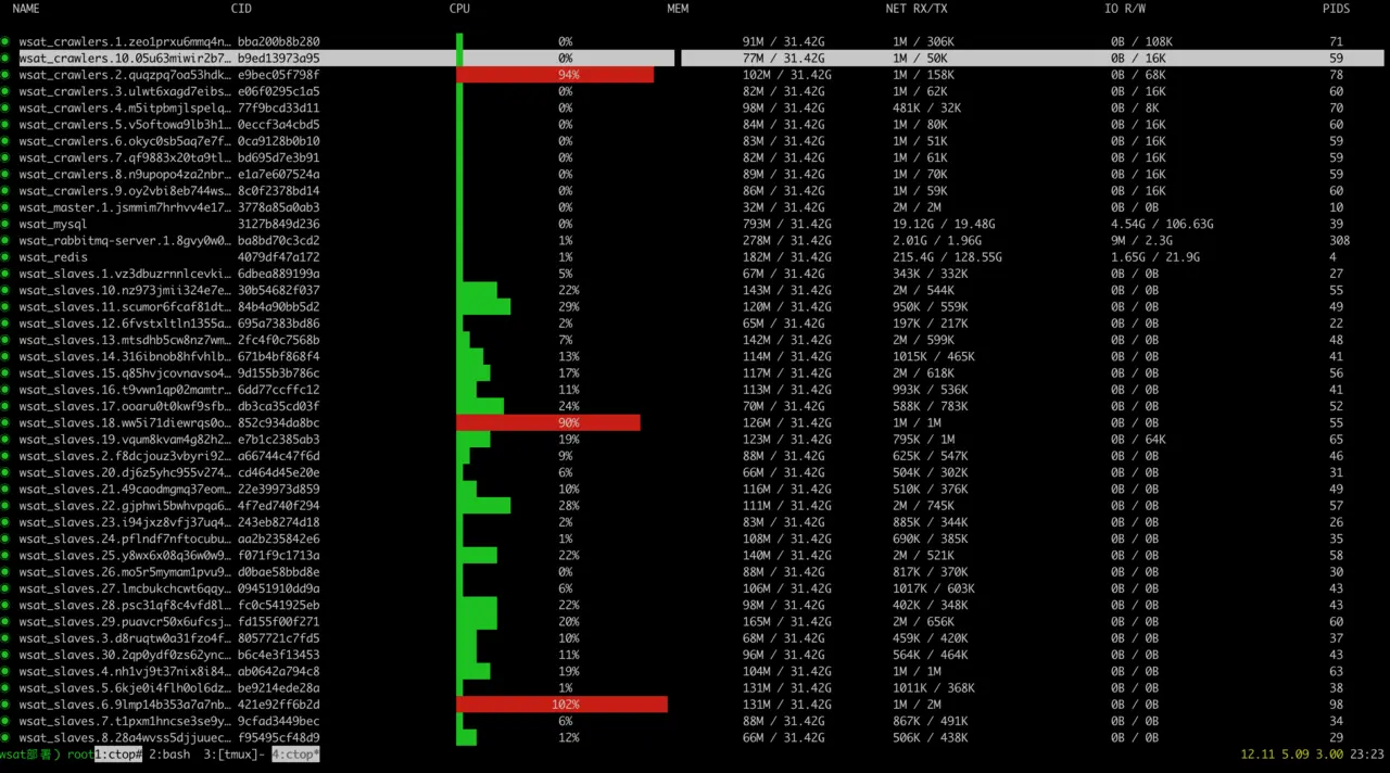 在集群运行之后,通过 ctop 命令我们能看到单机上启动的容器状态: