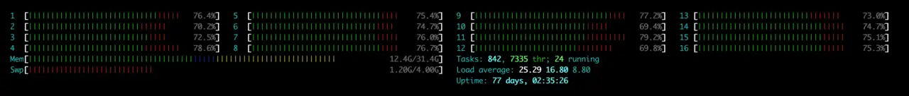 使用 htop 命令可以发现整个系统的 CPU 调用非常饱满: