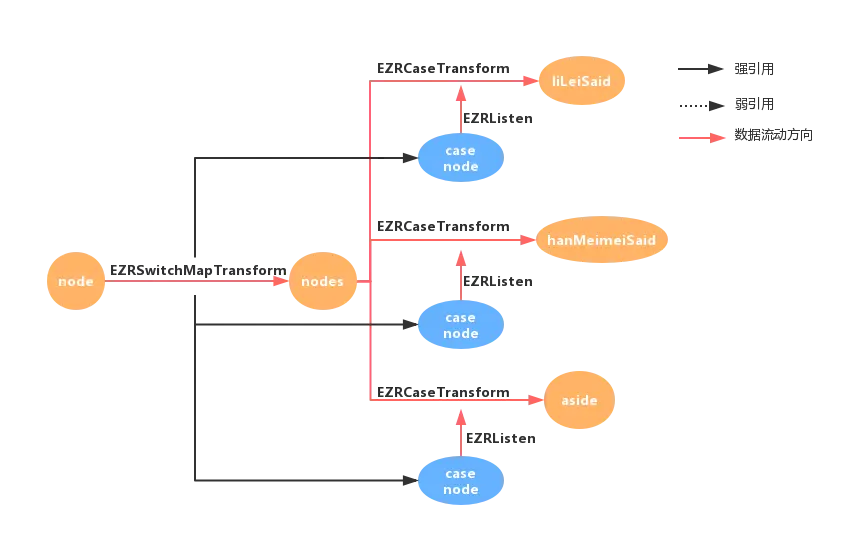 貌似没有case node节点也能实现 switch 功能,经过笔者思考,猜测作者此处设计的深意:由EZRSwitchMapTransform预处理得到key和最终需要传递的数据value;而EZRCaseTransform只需关心key是否对应,若对应才去监听对应的case node。如此做法有两点意义: