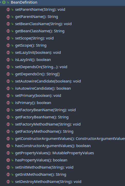 BeanDefinition是一个接口,描述了一个bean实例,它具有属性值,构造函数参数值以及具体实现提供的更多信息。