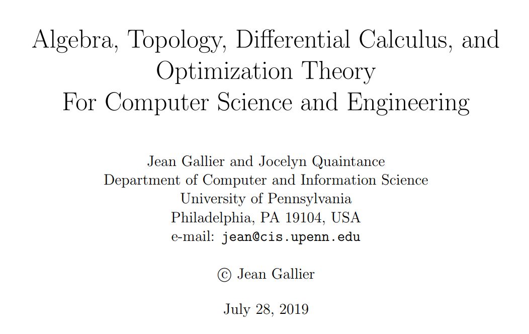 学习计算机科学总共需要多少数学基础?大概 1900 页吧。宾夕法尼亚大学计算机和信息科学系教授 Jean Gallier 的开源书籍《Algebra, Topology, Differential Calculus, and Optimization Theory For Computer Science and Engineering》用一本书的容量解决了所有问题。