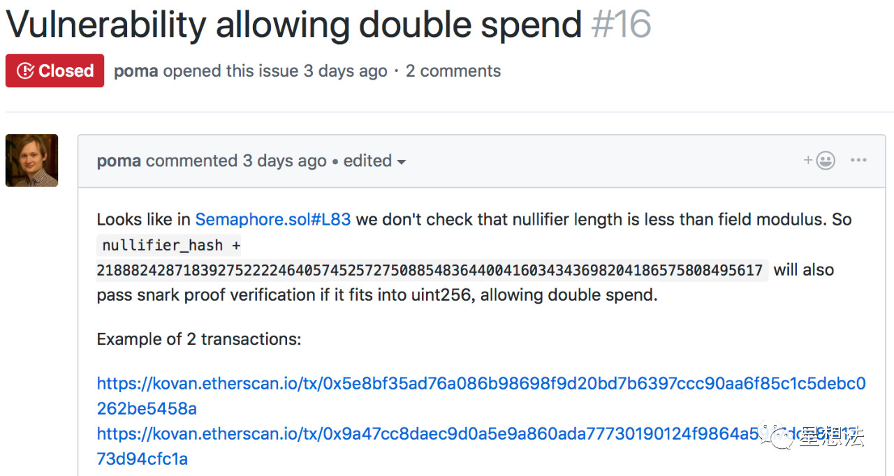 俄罗斯开发者poma,在项目semaphore提交了一个issue,公开了这个攻击方法。poma同时也在kovan测试网络验证了这种攻击方式。