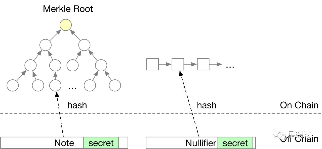 为了保护交易的隐私,在链上只存储Note和Nullifier对应的hash信息。Note代表可以花的钱,Nullifier表示某笔钱已经消费。Note和Nullifier一一对应,一个Note只存在一个Nullifier。通过zkSNARK生成证明,证明Note和Nullifier的正确性以及存在某种联系。在链上,为了防止双花,在执行某个交易时,必须确定某个Note是否已经消费。确定的方法就是记录下Nullifier对应的hash信息。