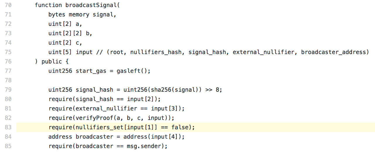 函数实现(第82行),调用verifyProof函数验证证明以及statement信息是否是合理的证明。第83行,查看nullifier_hash是否被用过。